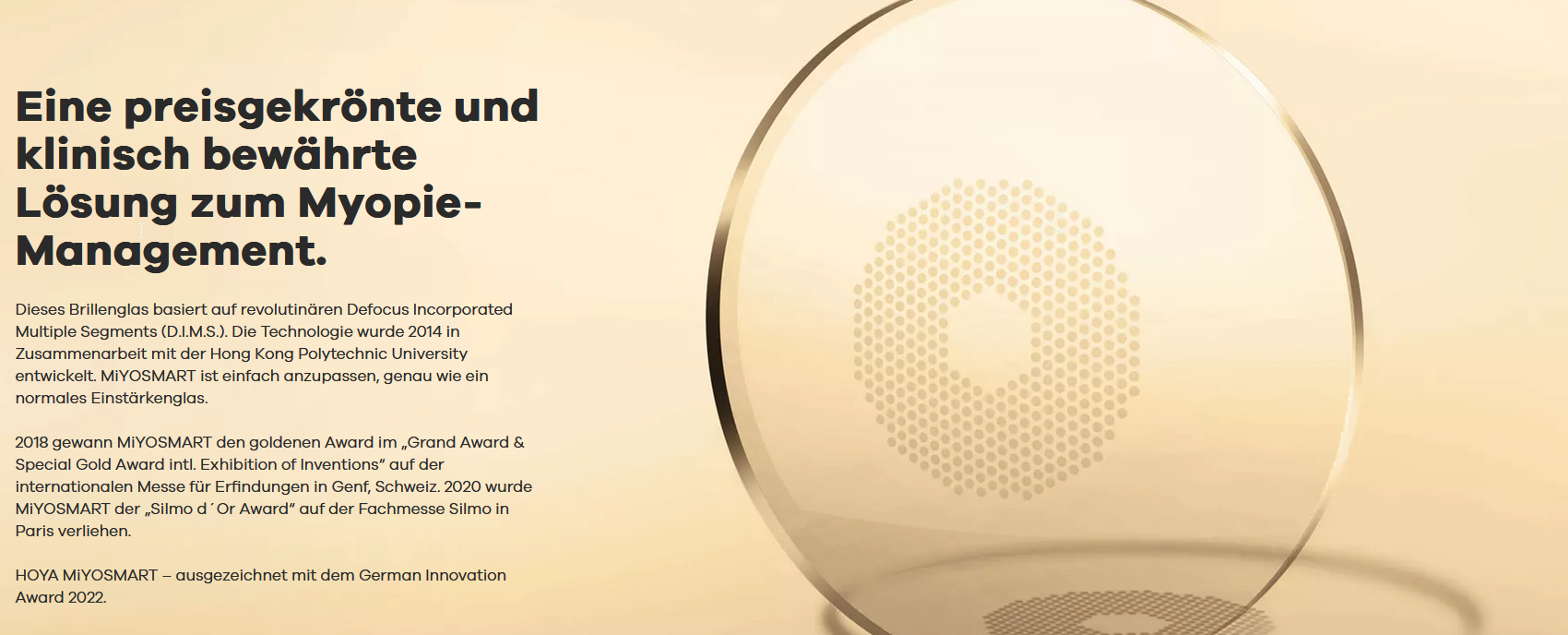 Eine unserer neuesten Innovationen ist MiYOSMART. Es ist ein Brillenglas, das speziell für das Myopie-Management bei Kindern und Jugendlichen entwickelt wurde – ein Feld mit schnell wachsendem Bedarf. In Zusammenarbeit mit unserem Forschungspartner, der Hong Kong Polytechnic University (PolyU), haben wir dieses innovative Brillenglas entwickelt, um Kurzsichtigkeit zu korrigieren und gleichzeitig deren Fortschreiten zu verlangsamen. MiYOSMART kommt in einer Zeit auf den Markt, in der sich die Kurzsichtigkeit auf dem Vormarsch befindet.